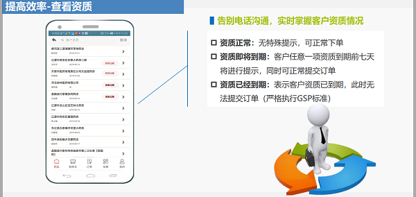客戶資質(zhì)、藥品庫存等信息實時查詢,告別低質(zhì)量電話溝通多名業(yè)務(wù)員,手機實時下單,內(nèi)勤快速審核,訂單狀態(tài)實時更新。